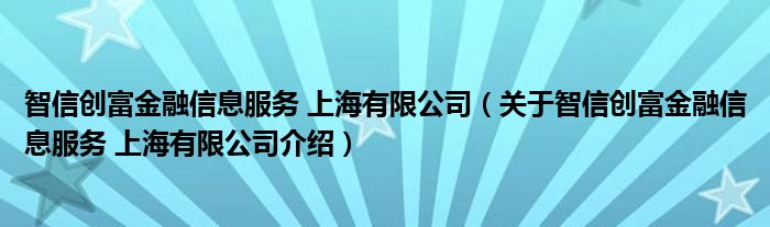 大家好,小夏来为大家解答以上的问题。智信创富金融信息服务 上海有限公司,关于智信创富金融信息服务 上海有限公司介绍这个很多人还不知道,现在让我们一起来看看吧!