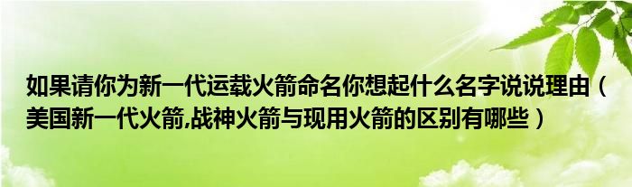 大家好,我是小小根,我来为大家解答以上问题。如果请你为新一代运载火箭命名你想起什么名字说说理由,美国新一代火箭,战神火箭与现用火箭的区别有哪些很多人还不知道,现在让我们一起来看看吧!