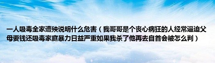 大家好,我是小根根,我来为大家解答以上问题。一人吸毒全家遭殃说明什么危害,我哥哥是个丧心病狂的人经常逼迫父母要钱还吸毒家庭暴力日益严重如果我杀了他再去自首会被怎么判很多人还不知道,现在让我们一起来看看吧!