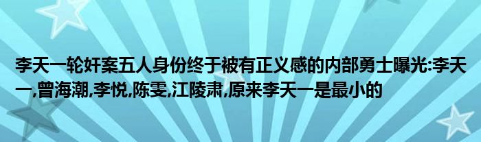 大家好,我是小根根,我来为大家解答以上问题。李天一轮奸案五人身份终于被有正义感的内部勇士曝光:李天一,曾海潮,李悦,陈雯,江陵肃,原来李天一是最小的很多人还不知道,现在让我们一起来看看吧!