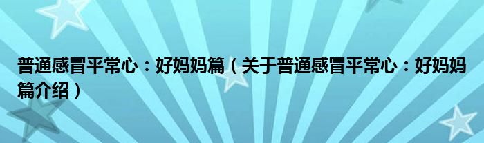 大家好,小夏来为大家解答以上的问题。普通感冒平常心:好妈妈篇,关于普通感冒平常心:好妈妈篇介绍这个很多人还不知道,现在让我们一起来看看吧!