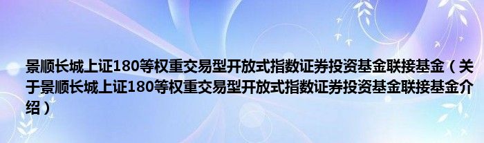 大家好,小夏来为大家解答以上的问题。景顺长城上证180等权重交易型开放式指数证券投资基金联接基金,关于景顺长城上证180等权重交易型开放式指数证券投资基金联接基金介绍这个很多人还不知道,现在让我们一起来看看吧!