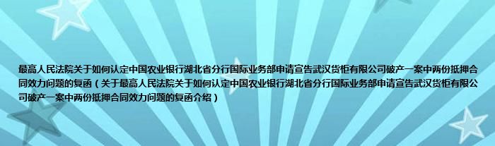 大家好,小夏来为大家解答以上的问题。最高人民法院关于如何认定中国农业银行湖北省分行国际业务部申请宣告武汉货柜有限公司破产一案中两份抵押合同效力问题的复函,关于最高人民法院关于如何认定中国农业银行湖北省分行国际业务部申请宣告武汉货柜有限公司破产一案中两份抵押合同效力问题的复函介绍这个很多人还不知道,现在让我们一起来看看吧!
