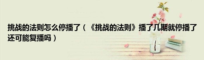 大家好,我是小小根,我来为大家解答以上问题。挑战的法则怎么停播了,《挑战的法则》播了几期就停播了还可能复播吗很多人还不知道,现在让我们一起来看看吧!